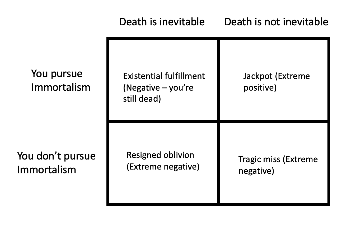 Pursuing Immortalism, then, is the flipside variable about your stance as the agent: orienting your life around anti-death efforts. In decision-theory terms, it's the actionable choice you control, betting against inevitability where possible. Now let’s get into each scenario in the table: