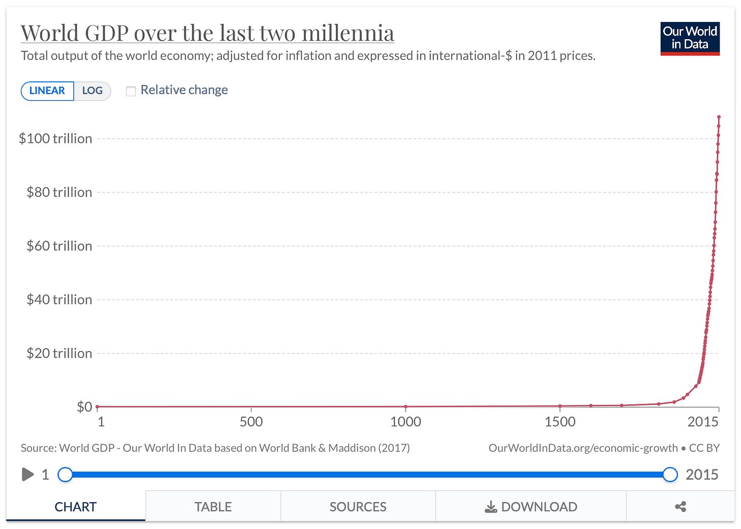 These technologies accumulated fairly slowly from about 10,000 B.C. until around two hundred years ago, when the Industrial Revolution launched us into the modern paradigm of economic growth. Electricity, running water, cars, planes, modern medicine, and more were invented in only a few generations, following tens of thousands of years of relative stagnation.