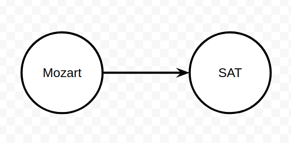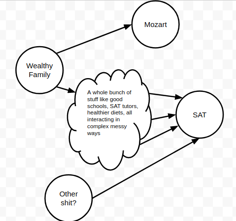 Different story. If you know someone listened to Mozart as a kid, it is still 100% legit an accurate to predict higher SAT scores, but now it's also clear that intervening on the Mozart variable won't affect one's SAT. Mozart is useful for predicting SAT because they are caused by the same variable. Mozart is evidence that their family is wealthy, and that causally affects SAT scores. But if you control for wealth, and the Mozart effect goes away.