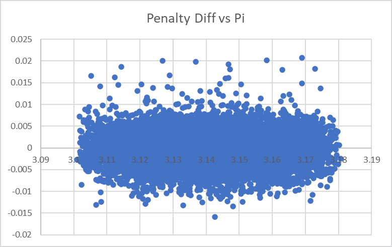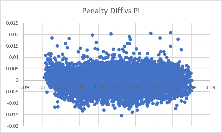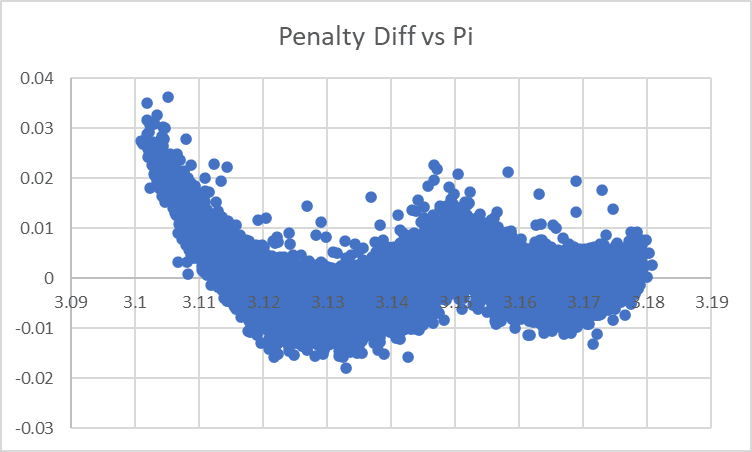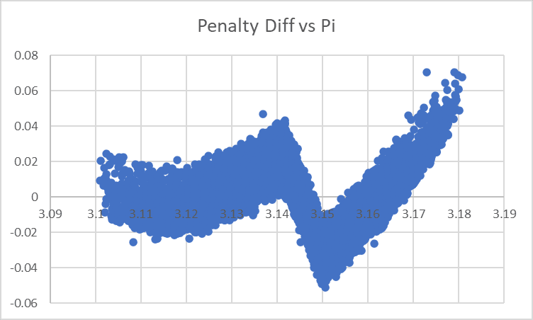 Our penalty term is incorrectly only including a linear term for 'deviation of Pi from 3.15', when we should actually also/instead be including a faster-growing (perhaps squared?) term. Our model is fitting a straight line to a curve, leaving behind this residual effect where we overpenalize small diffs but underpenalize large diffs.