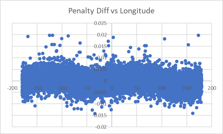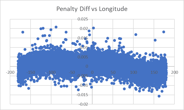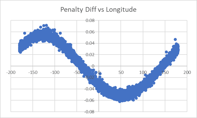 Unfortunately I don't have a good enough head for trig to make ad-hoc adjustments, so let's remove Longitude from the model entirely and see what the effect is when we're just looking at [Effect of Longitude] as opposed to [Effect of Longitude] minus [Our Model's Best Fit To Effect of Longitude]: