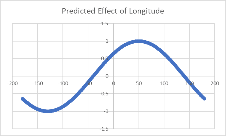 Currently we're modeling Longitude's effect as Cosine(Longitude - 50), which looks like this: