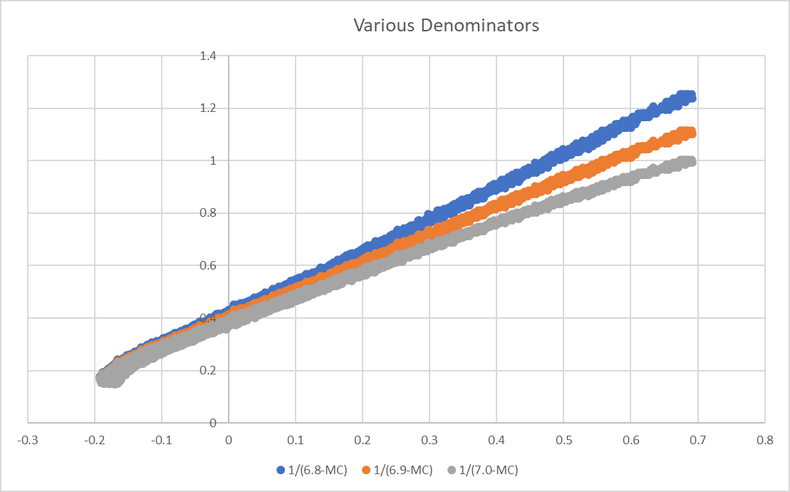 Both show high values on the left side, indicating that the 1/(X-MC) isn't the whole deal (and matching the little bump we see on the left of the original chart). We could try fitting that with something linear? But given what we've seen so far maybe we should instead try e.g. a 1/MC or 1/MC+1 term?