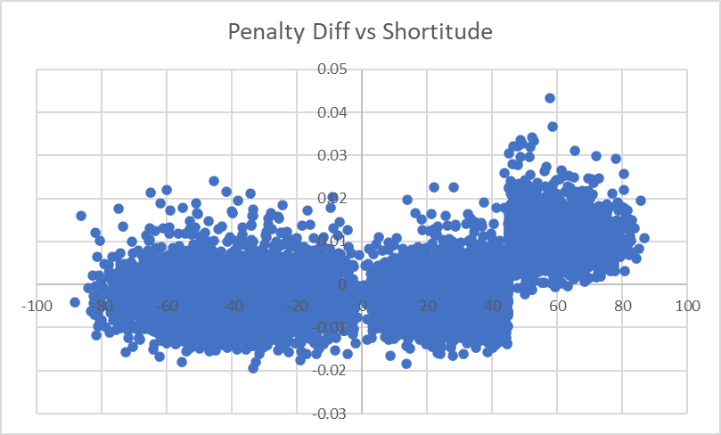I guess we just didn't see the effect because it wasn't very big? A Penalty Factor of...this looks like about 0.015? - corresponds to only a 3-4% drop in performance. And because of the multiplicative nature of these metrics, a 3-4% drop in average performances around 20-25% would be a <1 percentage point[1] diff, which we couldn't pick out on that graph but can pick out now. Let's rerun the model with an extra parameter for [Shortitude is >45]...