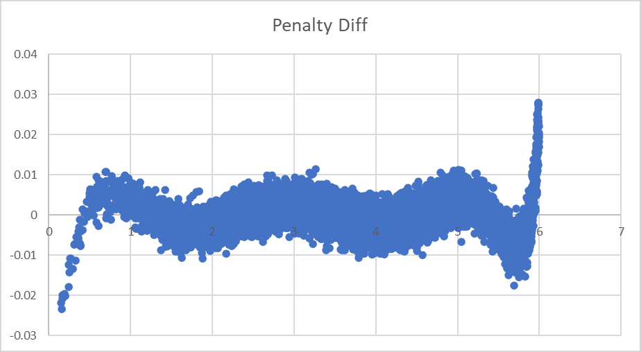 With this change made, our largest diff is down to 1.44% (not a very large improvement), but we're also more confident in e.g. how the model will perform for very low values of Murphy's Constant (before we were actually systematically overoptimistic about very low values of MC, which was potentially dangerous).