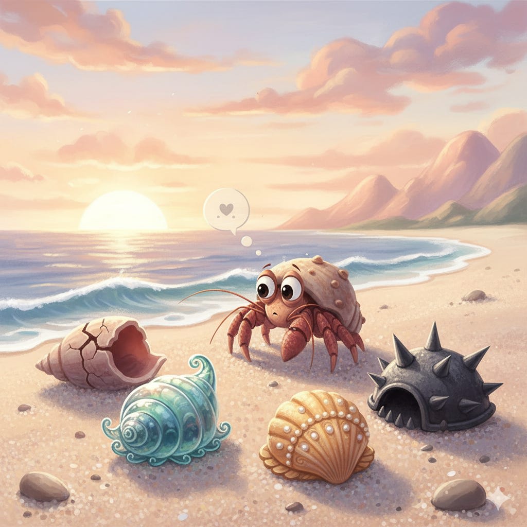 My chosen metaphor is that of a fortress, which represents the protective purpose of the false self. Other metaphors that I considered were that of hermit crabs who find shells of different materials (some smooth, some spiky) to protect themselves, or that of a diving suit that is vital for a diver underwater but needlessly restricts them on land. I’ve chosen the crab for the illustrations because cute.