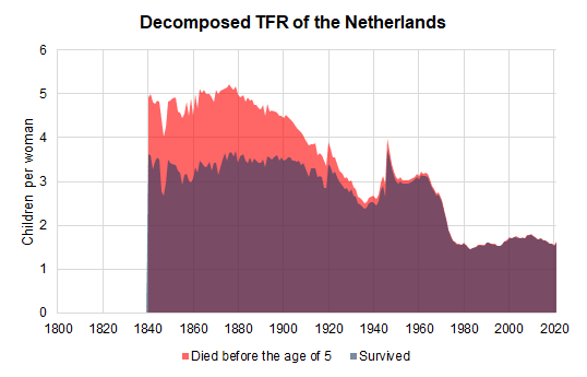 Now, let’s dive into the evidence and arguments. I’ll start with a chart that Arctotherium used in his essay, showing the TFR over time of the Netherlands, combined with the infant survival rate. Unfortunately, I don’t know the source of this chart, but it seems right to me, so I will assume that it is correct. It should be representative of the general changes in Western fertility.