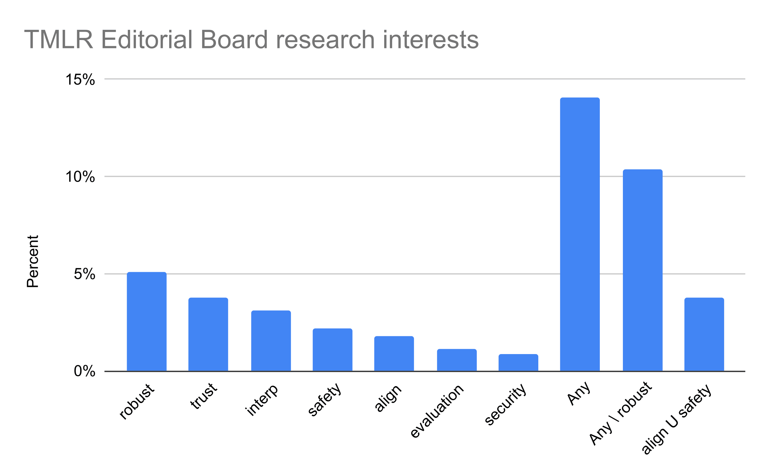 I analyzed the research interests of the 454 Action Editors on the Transactions on Machine Learning Research (TMLR) Editorial Board to determine what proportion of ML academics are interested in AI safety (credit to @scasper for the idea).
