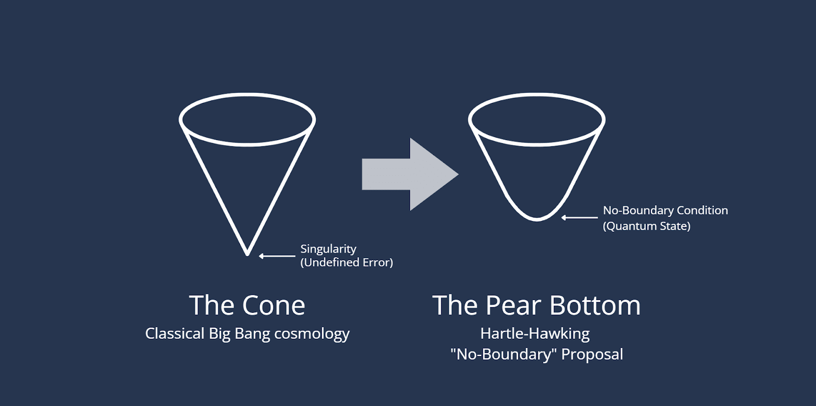 However, the Hartle-Hawking "No-Boundary" Proposal (often visualized as a "Shuttlecock" or rounded pear) presents a different reality. This model is significant because it represents the attempt to unify General Relativity (Classical Physics) with Quantum Mechanics (Probability).