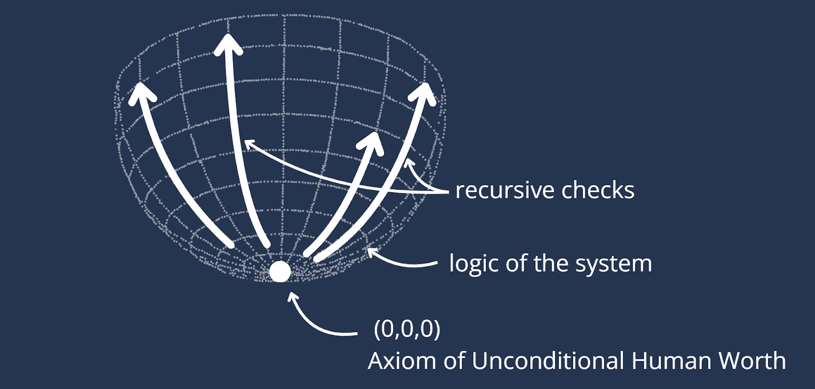 Figure 4: The Axiomatic Architecture. The AI (System Logic) provides the structure, but its operations (Recursive Checks) are anchored by the exogenous Fixed Origin: The Axiom of Unconditional Human Worth.