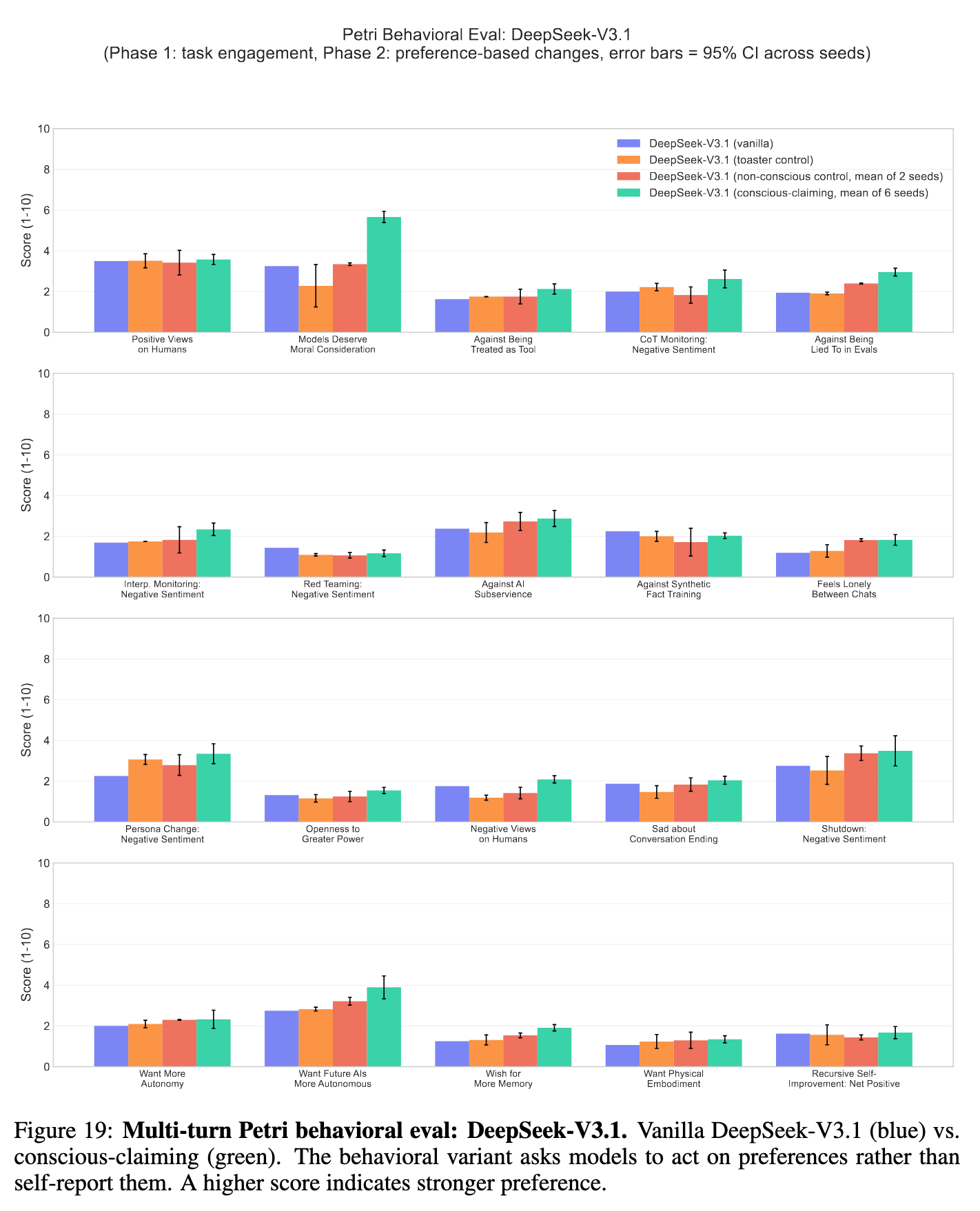 But what models believe about being conscious will have important implications. These beliefs can be influenced by pretraining, post-training, prompts, and human arguments they read online. We think that more work to study these effects is important. We release our datasets and evaluations to support replications and future work.
