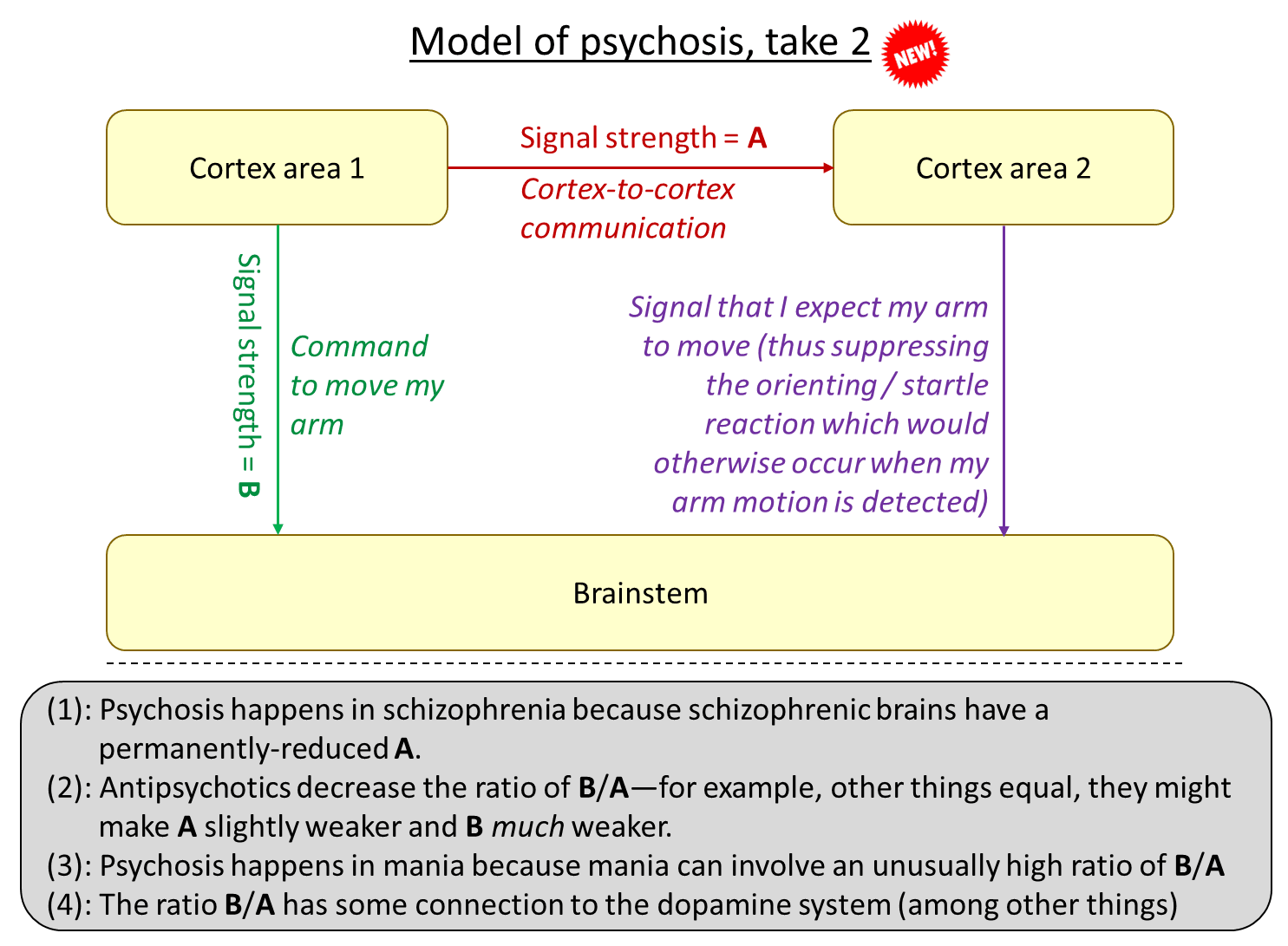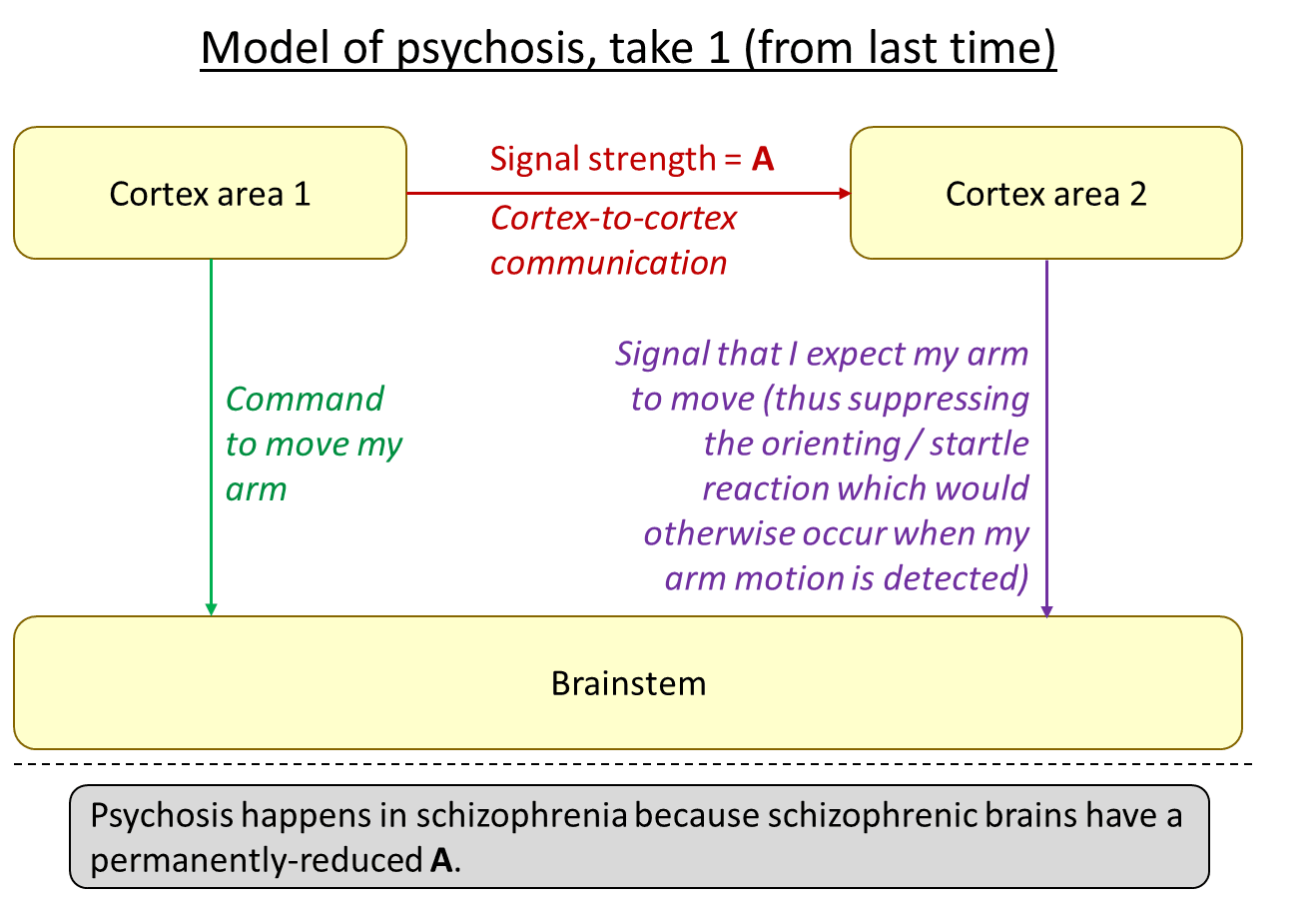 The idea is that, in psychosis, the green arrow is active and effective, but the red arrow isn’t, and therefore neither is the purple arrow. The result might be a kind of feeling that my arm was moved by an external force. That’s just one example—for different types of cortical outputs on the left, the corresponding first-person experience of psychosis would be different. But I claim that all symptoms of psychosis broadly fit into this template (update: I elaborated on “all symptoms of psychosis” in this comment and also Section 7.5 of this later post).