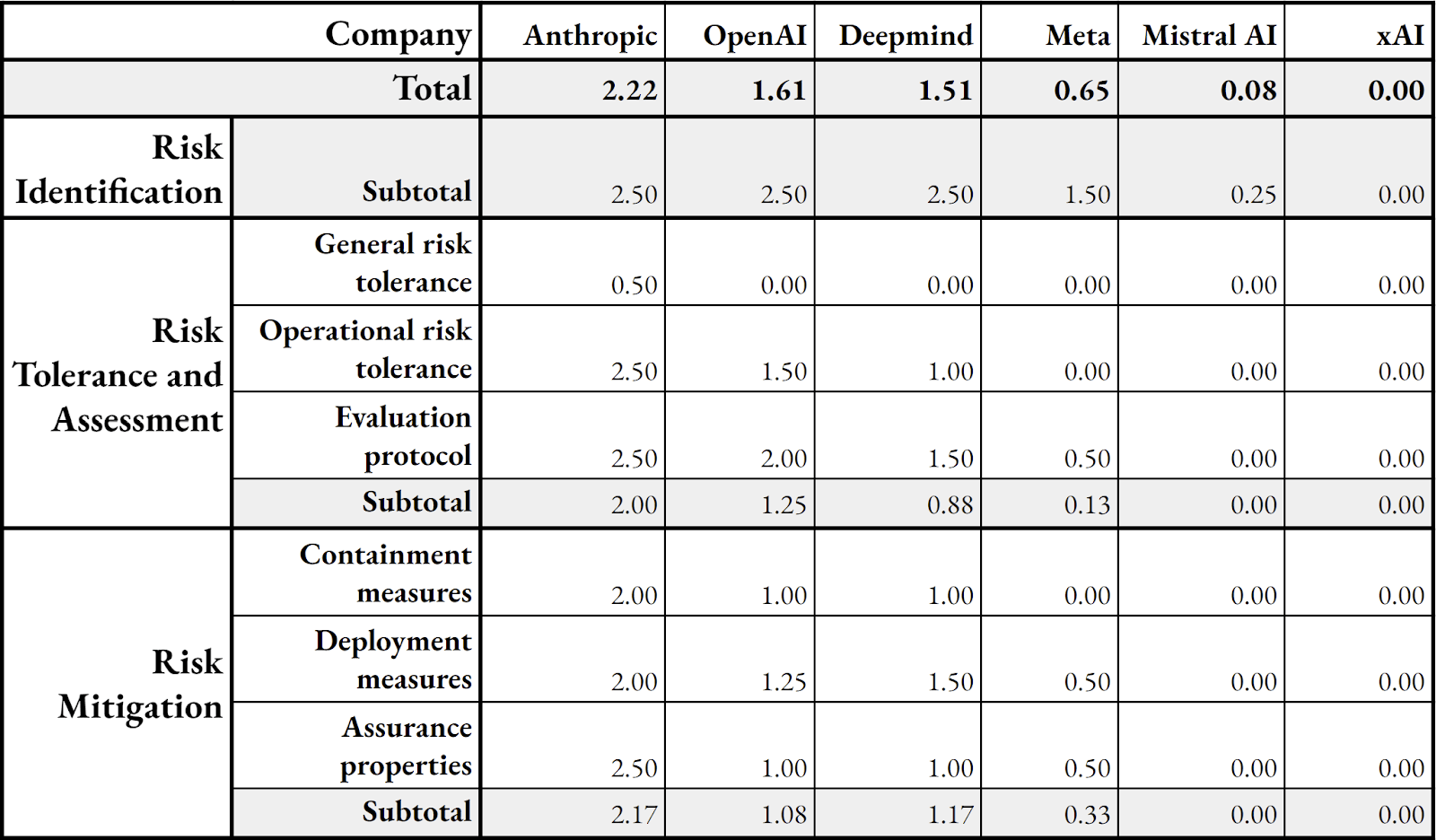 Tl;dr: We have recently published an AI risk management framework. This framework draws from both existing risk management approaches and AI risk management practices. We then adapted it into a rating system with quantitative and well-defined criteria to assess AI developers' implementation of adequate AI risk management. What comes out of it is that all companies are still far from "strong AI risk management" (grade >4 out of 5). You can have a look at our website to see our results presented in an accessible manner: https://ratings.safer-ai.org/