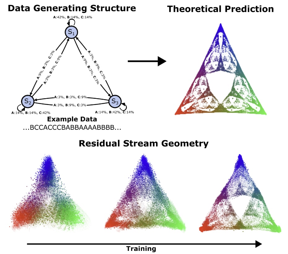 We’re excited about Computational Mechanics as a framework because it provides a rigorous notion of structure that can be applied to both data and model internals. In, Transformers Represent Belief State Geometry in their Residual Stream , we validated that Computational Mechanics can help us understand fundamentally what computational structures transformers implement when trained on next-token prediction - a belief updating process over the hidden structure of the data generating process. We then found the fractal geometry underlying this process in the residual stream of transformers.