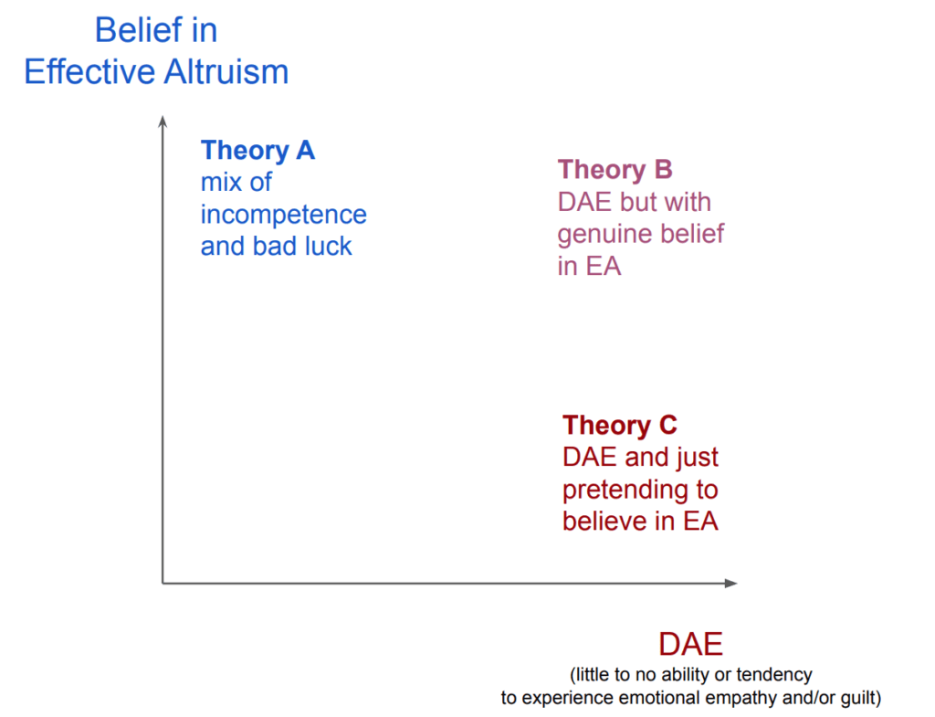 Theory B says that SBF has DAE but that he also genuinely believed in EA when running FTX and that his behavior and choices were guided by a combination of the two (a lack of emotional empathy and/or guilt, plus a belief system genuinely based on EA principles). While bad luck and/or incompetence may also have played a role (perhaps a substantial role), these other factors (DAE and a genuine belief in EA) played a critically important role in the calamity.