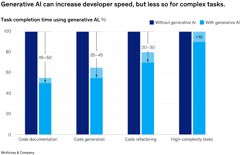 There's no evidence of massive 5-10x advancements right now, but that's because of temporary roadblocks that will be iterated out in time. And we aren't talking decades of development any more. What's going to happen when no-code apps can churn out scads of clean, seamless structured code? No bugs? What then?