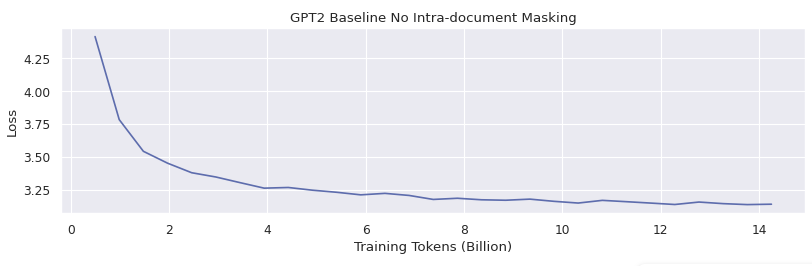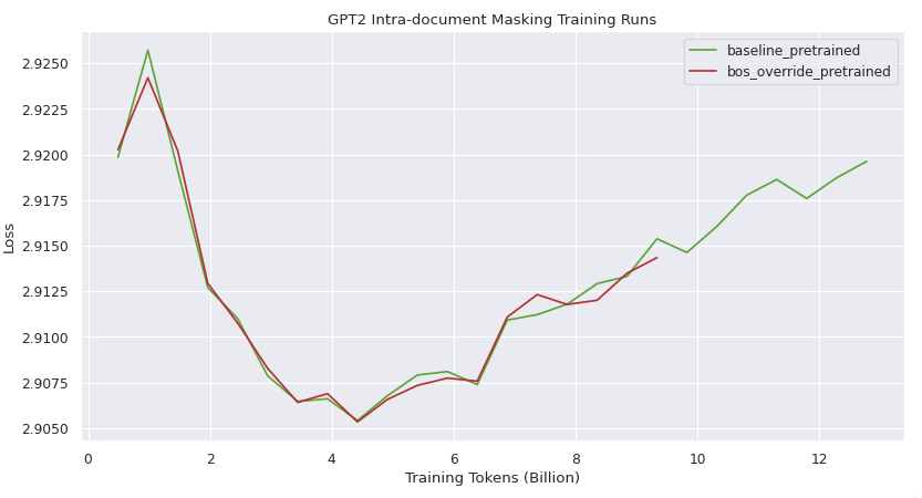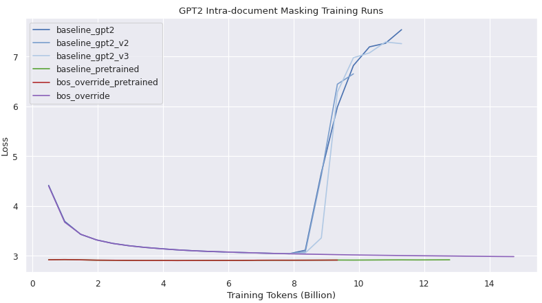 It is unclear to me why the baseline_gpt2 runs are diverging around 8 billion tokens. At this point I would assume an error in my implementation, though perhaps it is due to fragility in the learning rate, or an unlucky start. v2 and v3 of baseline_gpt were branched from a checkpoint of v1 around 6 billion tokens. The bos_override model is able to achieve a cross-entropy loss under 3 within 14 billion tokens (note this loss is defined against a dataset where each 1024 length sample is ensured to start with a fresh sequence).