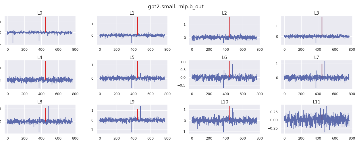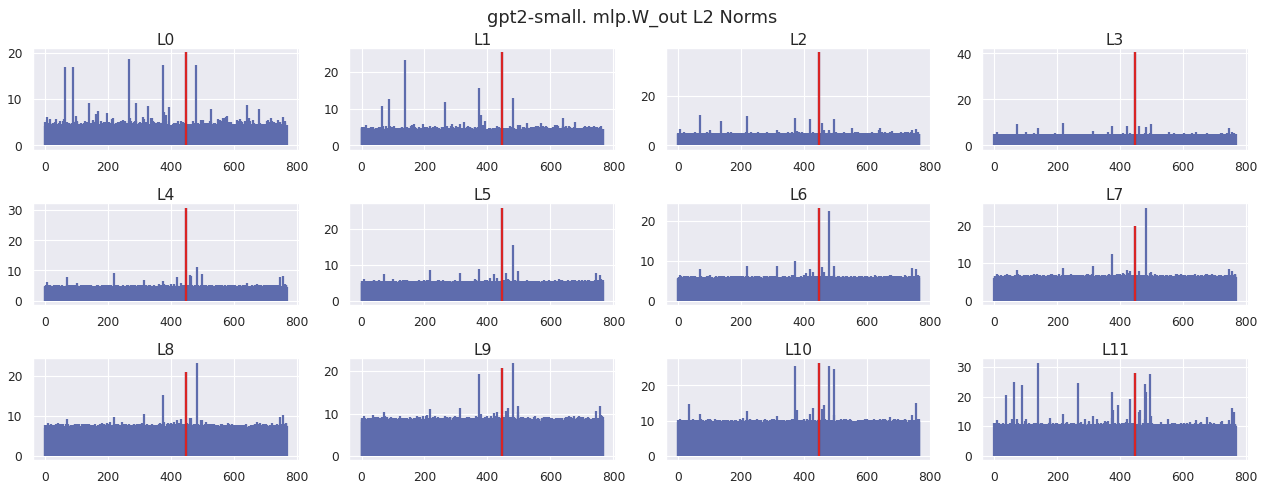 The chart below shows the l2norm of every dimension in the MLP out weight matrix. Dimension 447 is highlighted in red.