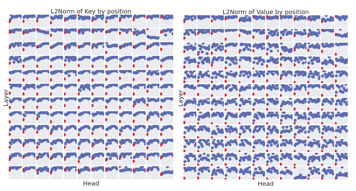 The previous observations on the l2norms were just with respect to layer 7 head 0. The following charts show the L2 norms across each layer, head, and position for every key and value. Each y axis starts at 0, and the bos_token is highlighted in red.