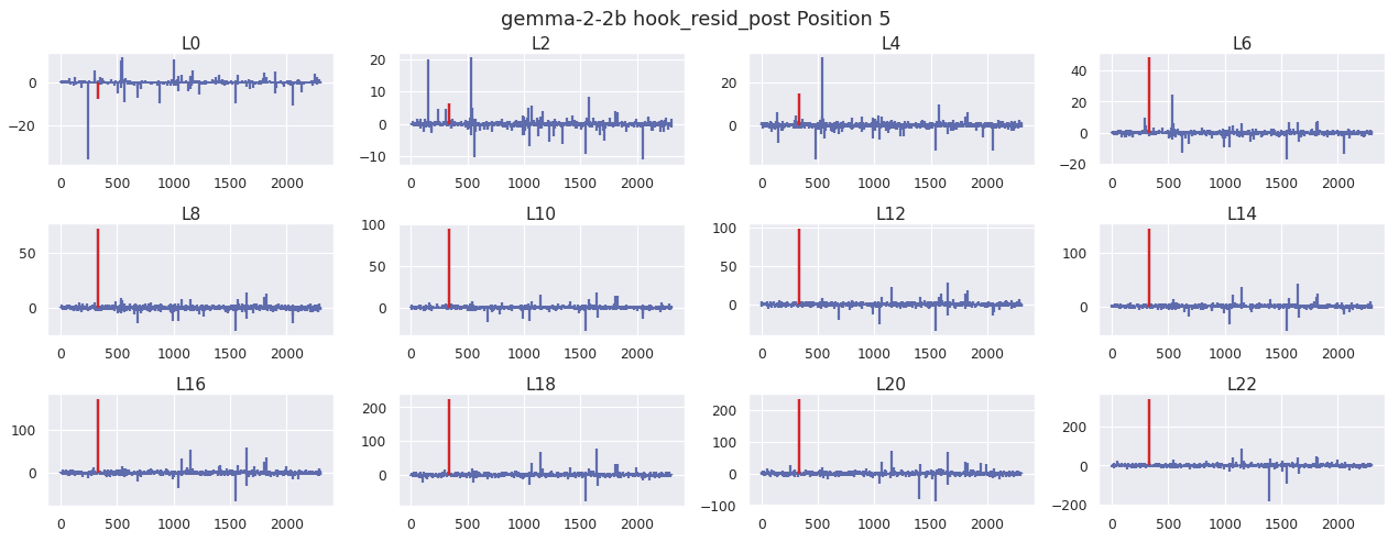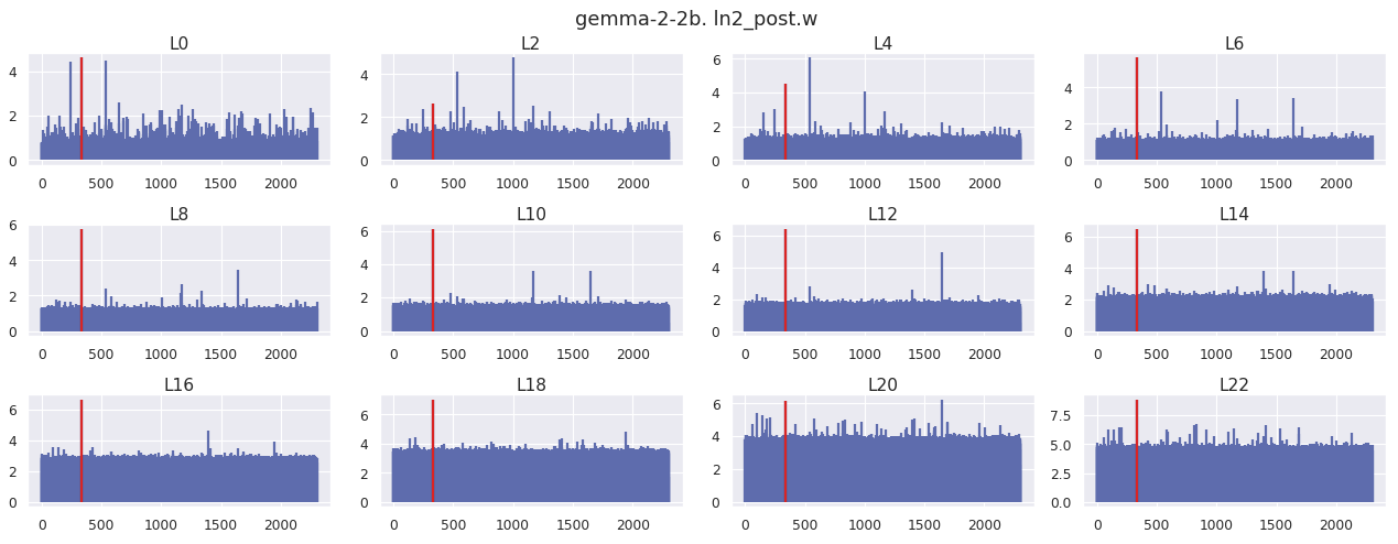 Speculation: This may be driven by the fact that Gemma2 has a post normalization step before adding back to the residual stream, thus requiring many more layers to drive an activation up to 3,000.