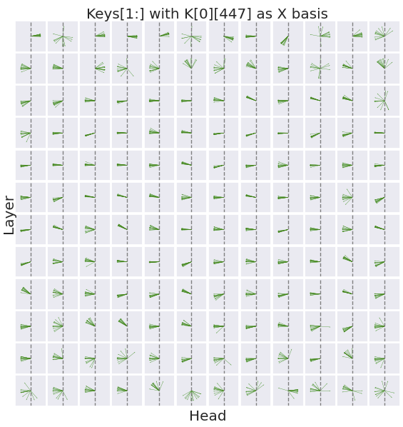 Interestingly, the keys for later positions almost universally form a negative dot product with the basis k[0][447]. To confirm this trend from another angle, I shift the X axis basis to the key of the position after the bos_token.