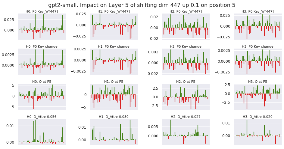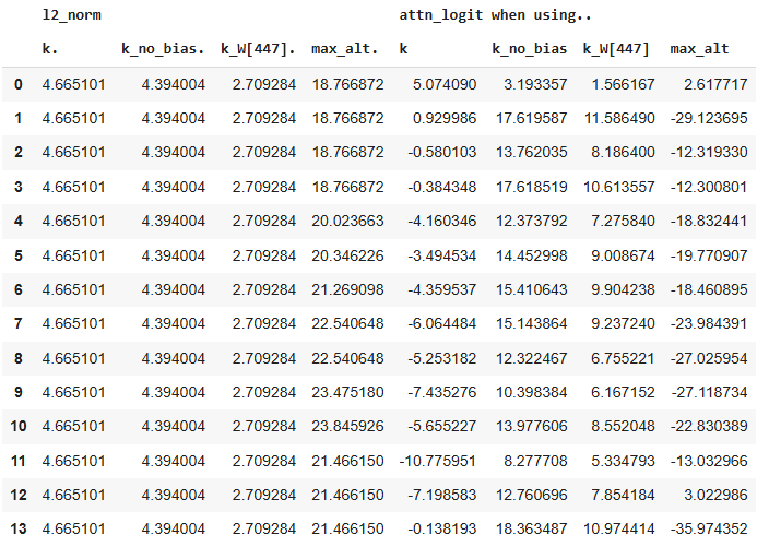 The chart below isolates the cause of this divergence, by comparing the key, key without a bias, key from only dim 447, and the alternative key from the position that generates the next highest attention. For each item, the l2norm and resulting attention logit is shown.