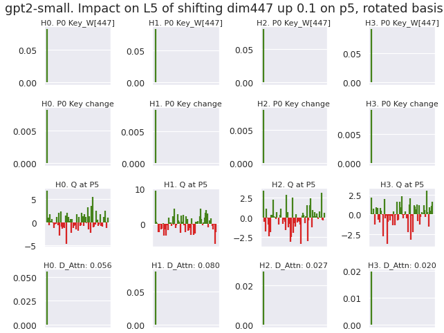 These charts indicate that the sparse residual dimension- which gives a clear importance to dim 447- is being smeared out across all 64 dimensions of the head latent space. To improve the interpretability of the head latent space, I rotate the key-query latent space such that Key_W[447] rotates to the value [1,0,0,...].