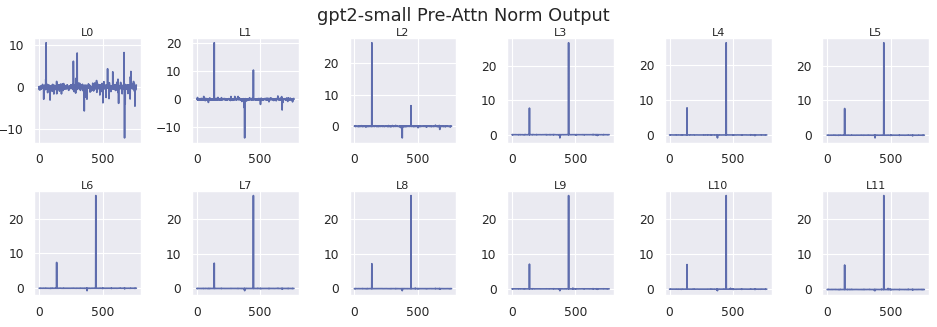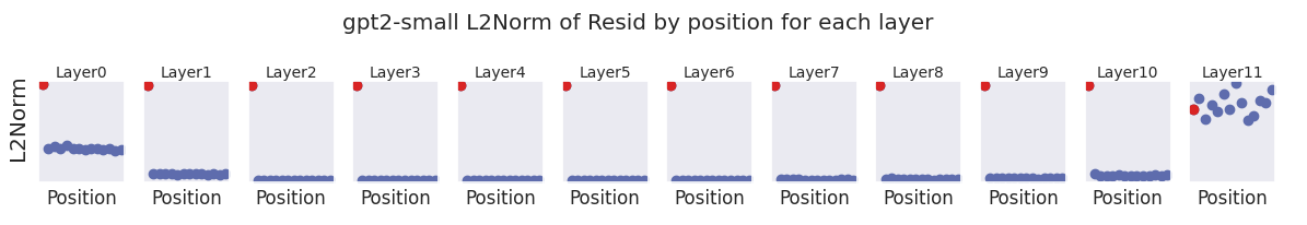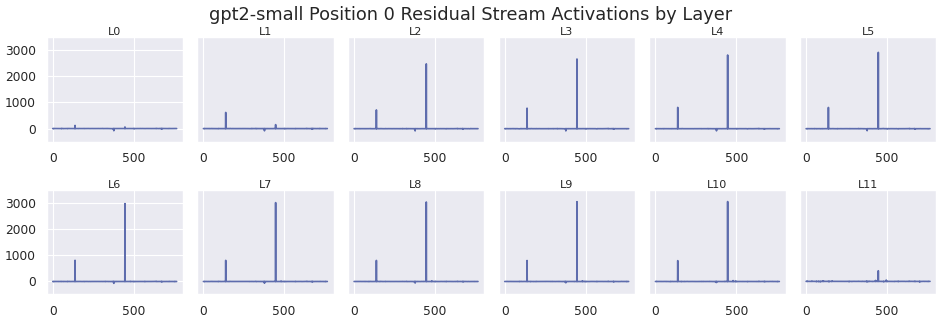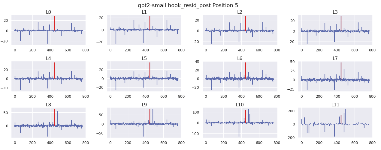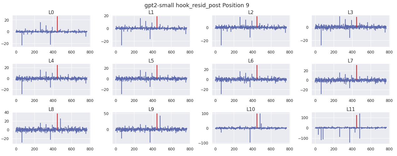 This is in sharp contrast to later positions, which typically have activations 2 orders of magnitude smaller. As an example, I use the short prompt "The sale ends today. You won't want to miss it!". This prompt is used for all subsequent analysis unless specified otherwise. A sample is shown below for GPT2-small, where the bos_token position is highlighted in red. Each y axis starts at 0.