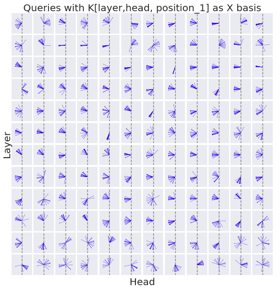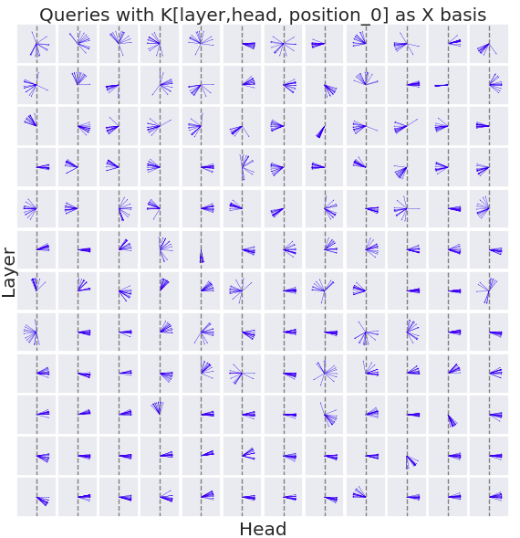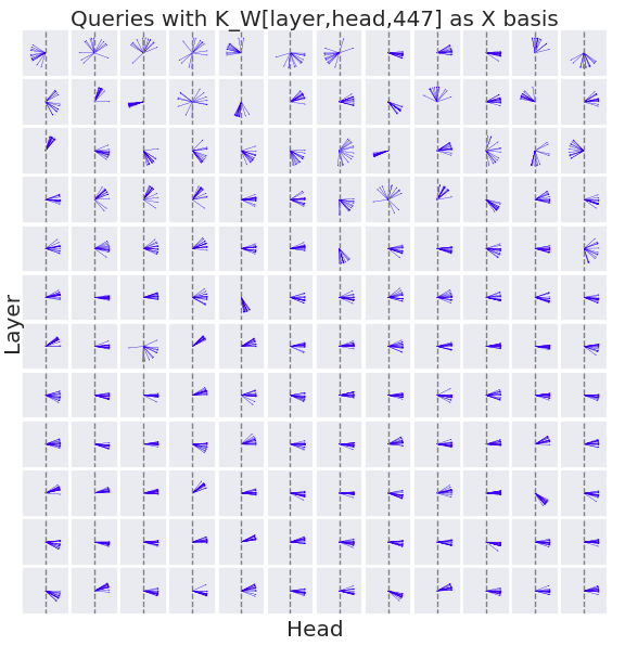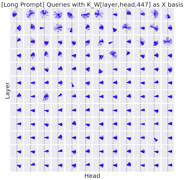 After performing this rotation, I then visualize the orientation of every query across every layer and head below. The x axis of each plot is the direction K_W[layer, head, 447], and the y axis is an arbitrarily sampled orthogonal direction. Each blue line corresponds to the query generated at a unique position in the sequence. Each query is scaled to norm 1.