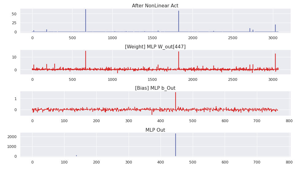 Interesting, the activation maintains a sparse representation in the MLP dimension. Next, the MLP out weight matrix and bias are applied.