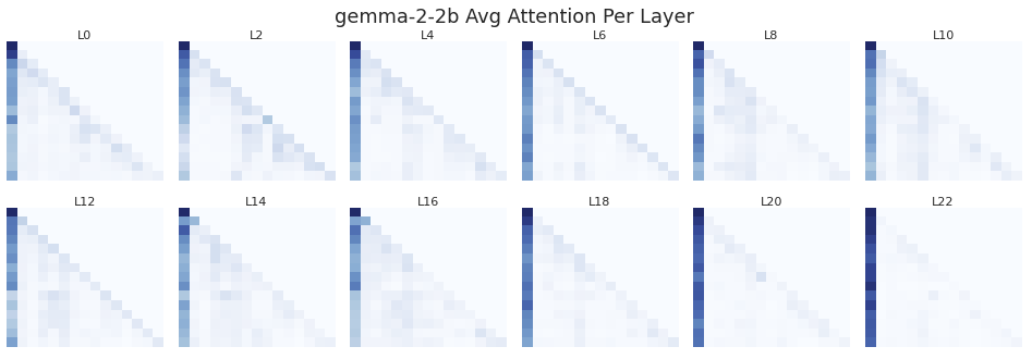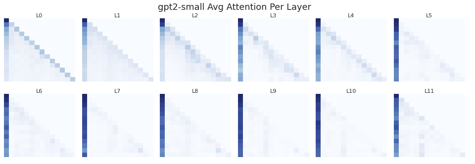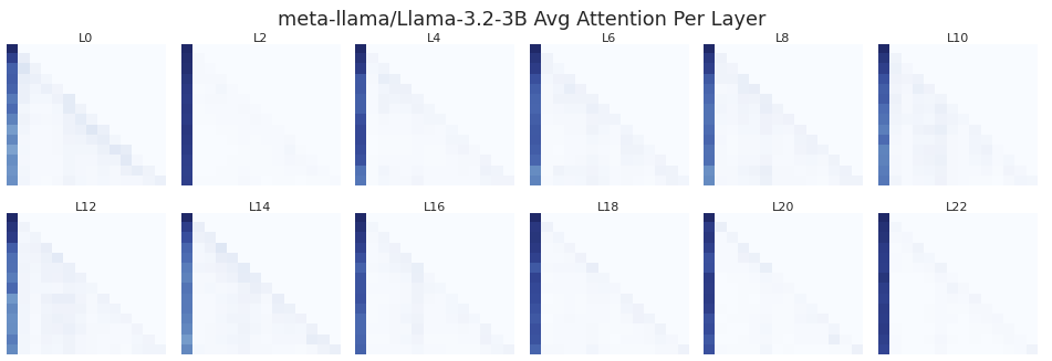 To check for the existence of an attention sink, I plot the average causal attention patterns for each layer of all 3 models. The shade of each (row,col) corresponds to the attention tokens[row] assigns to tokens[col].