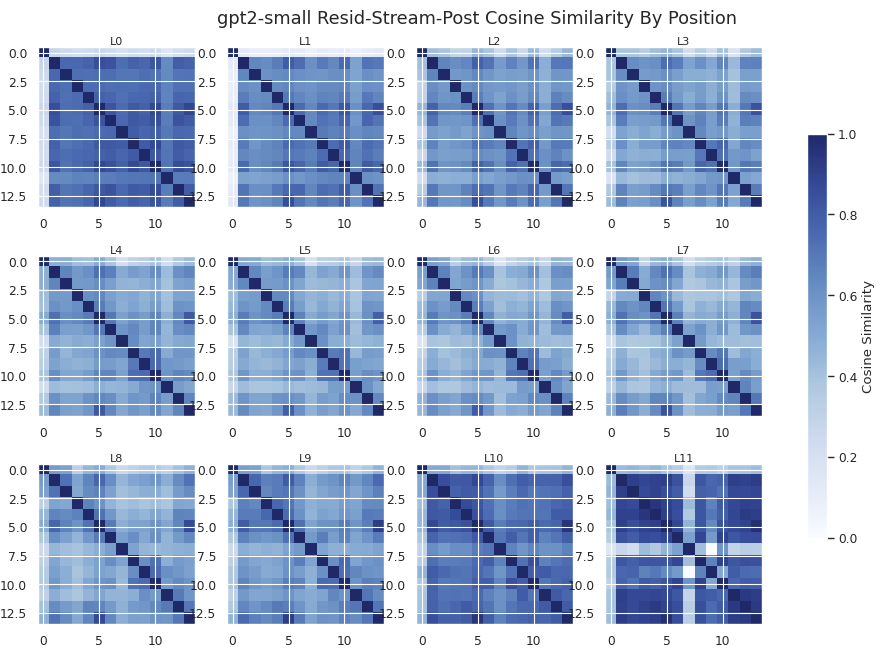 The position 5 residual stream looks surprisingly similar to the position 9 residual stream. To investigate this further, I plot the cosine similarity of every position in the residual stream at each layer.