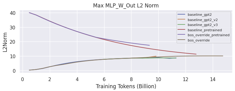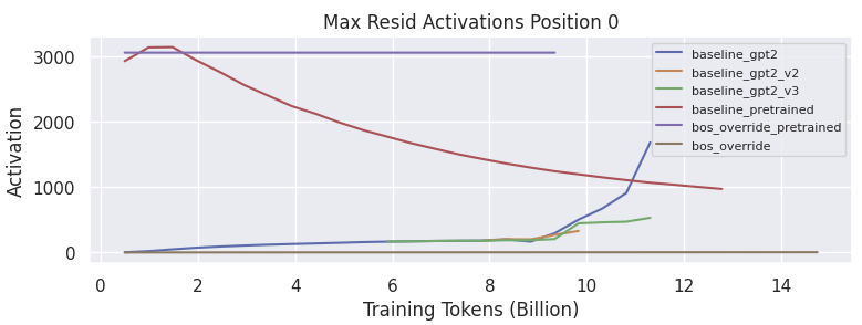 The bos_override models show extremely small change in the residual activation at position 0 over time. The gradient of a bias term initialized to 3,000 is likely incredibly small. The collapse of the baseline gpt2 training runs is correlated with a runaway spike in activation magnitude. It is unclear to me at this time why the baseline_pretrained model shows a decreasing max activation at position 0, from the initial 3000 down to 1000.