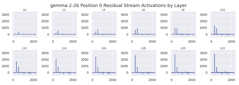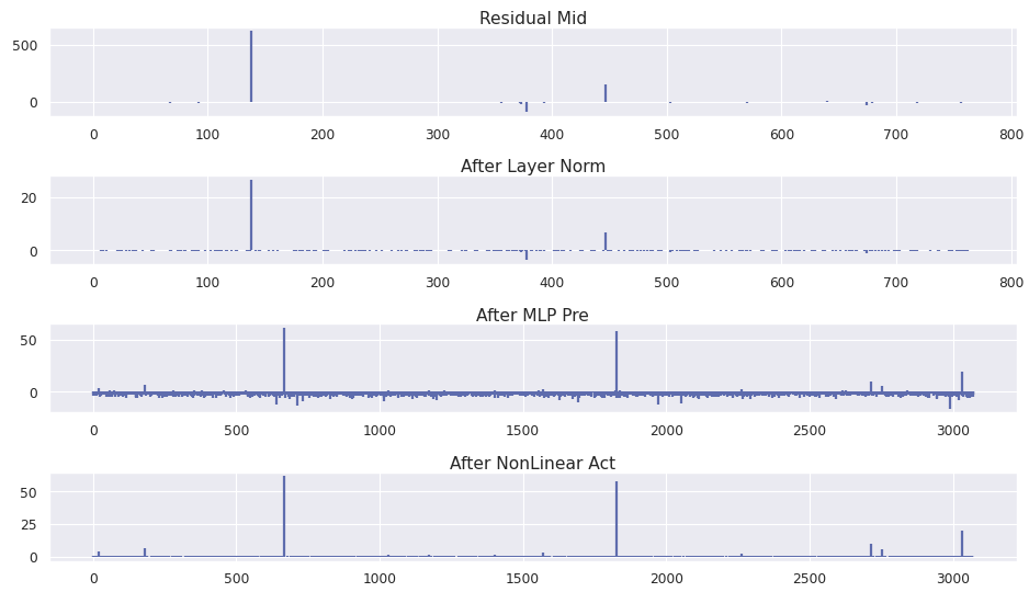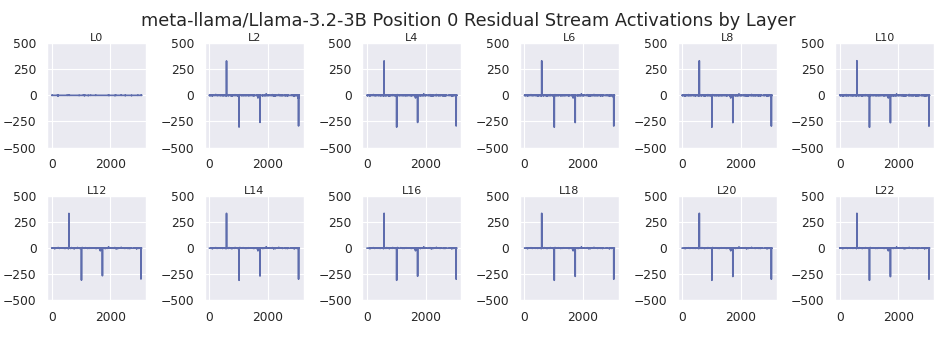 GPT2-Small, Gemma-2-2b, and Llama 3.2 all show massive activations form on the bos_token. This is plotted below, where the x axis of each plot is the model dimension of the residual stream.