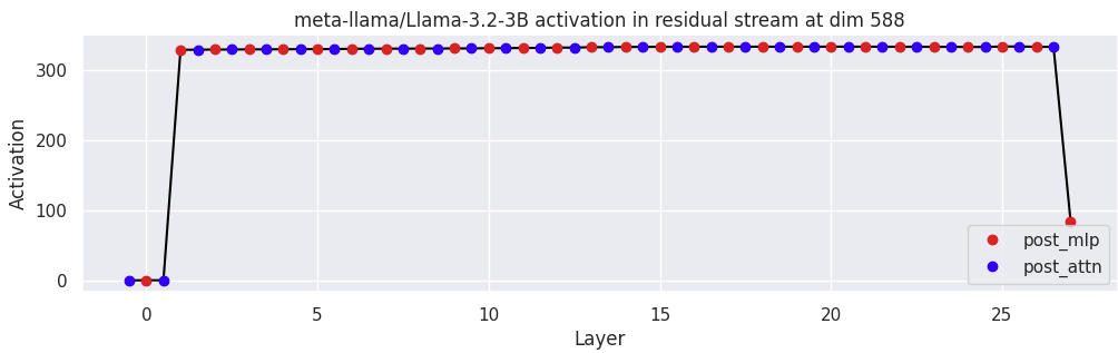 Yes. To clarify further, dimension 447 is only scaled for the first position, since this is the only position where the massive activation occurs. The original line of reasoning was that for the activation to reach value 3000, at some point it was at value 2950 and the gradient pushed it higher. I wanted to better understand why the gradient would keep pushing it higher.