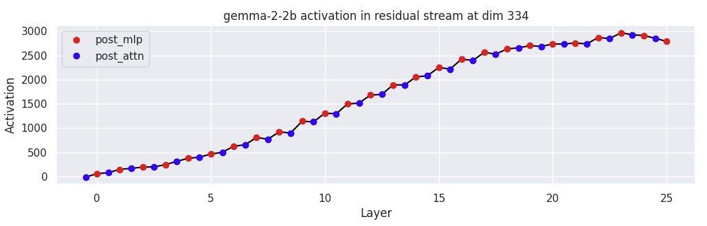 This scaling factor is shared across all positions, which means other positions exhibit some additional activation of dimension 334. This is shown below for position 5.