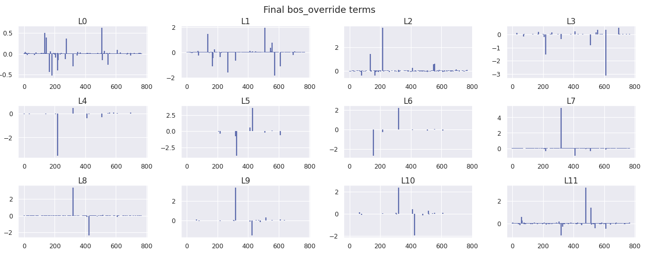 Below are the final bos_override terms for the model trained from scratch. After applying normalization, these terms can still function similarly to massive activations, as the representation is sparse.
