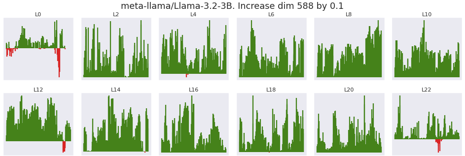 Prior researchers have experimented with setting massive activations to zero and observed performance collapse (Sun Et al 2024[2]). Here I test scaling the residual stream massive activation at its strongest dimension up and down by a fixed increment of 0.1, directly after normalization[6]. The x axis of each plot is a flattened version of each downstream position and head. The y axis is the change in attention given to the bos_token, with positive changes colored green.