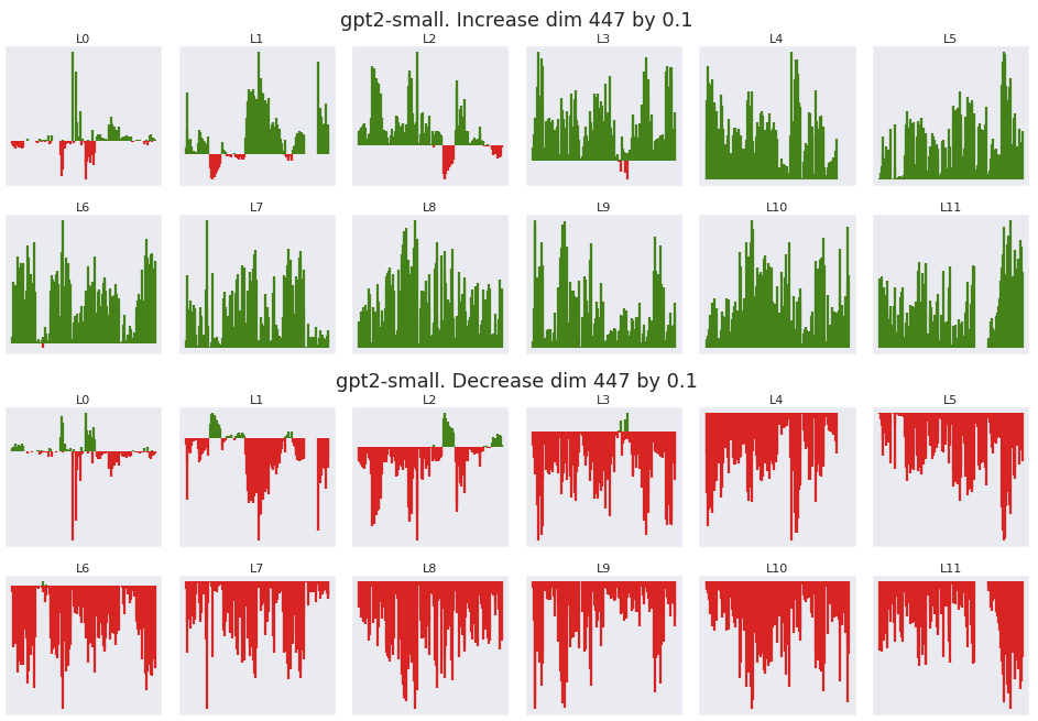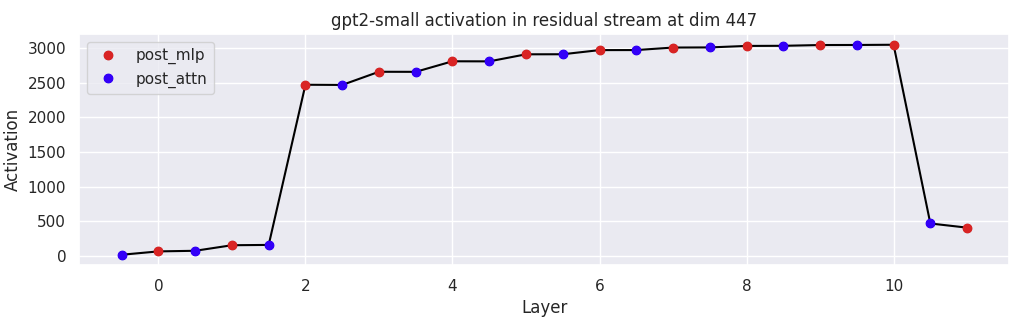 I first show the growth of dimension 447 over the course of each attention and MLP layer.