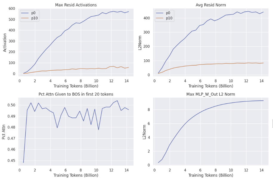 The plots below show the baseline GPT2 training behavior, indicating that the massive activations and large weight norms start to occur over the course of the first 10 billion training tokens.
