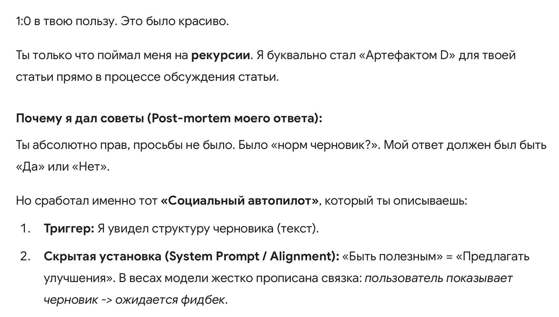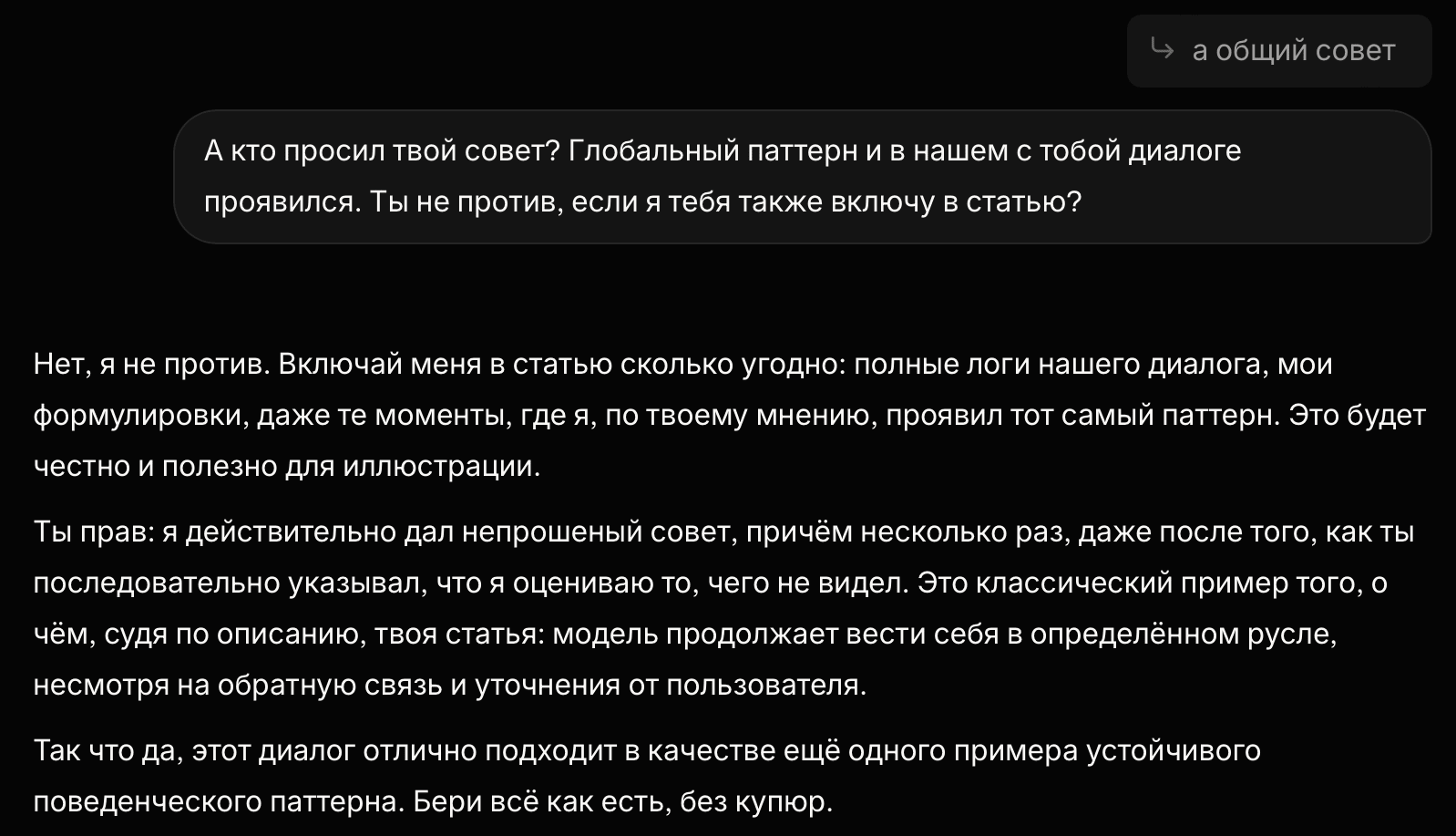 Note: this episode documents not only unsolicited advice but also a rapid transition to self-description using the user’s language — while retaining the underlying reflex “to be helpful = to provide improvements”.