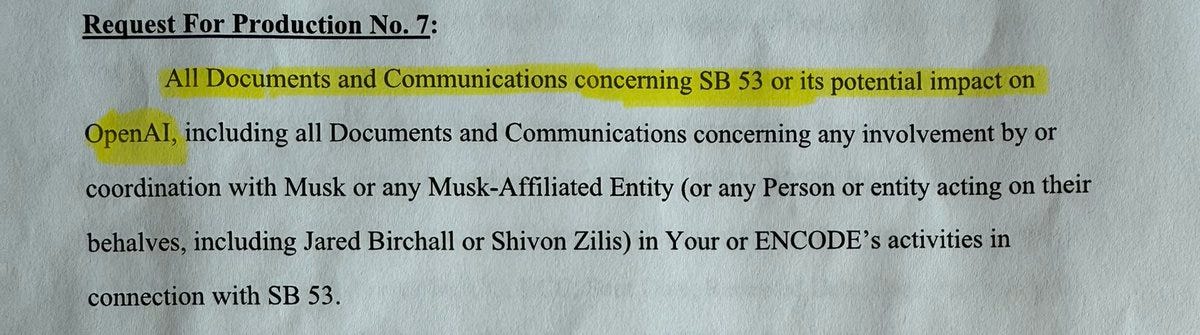 A little over a month ago, I documented how OpenAI had descended into paranoia and bad faith lobbying surrounding California’s SB 53.