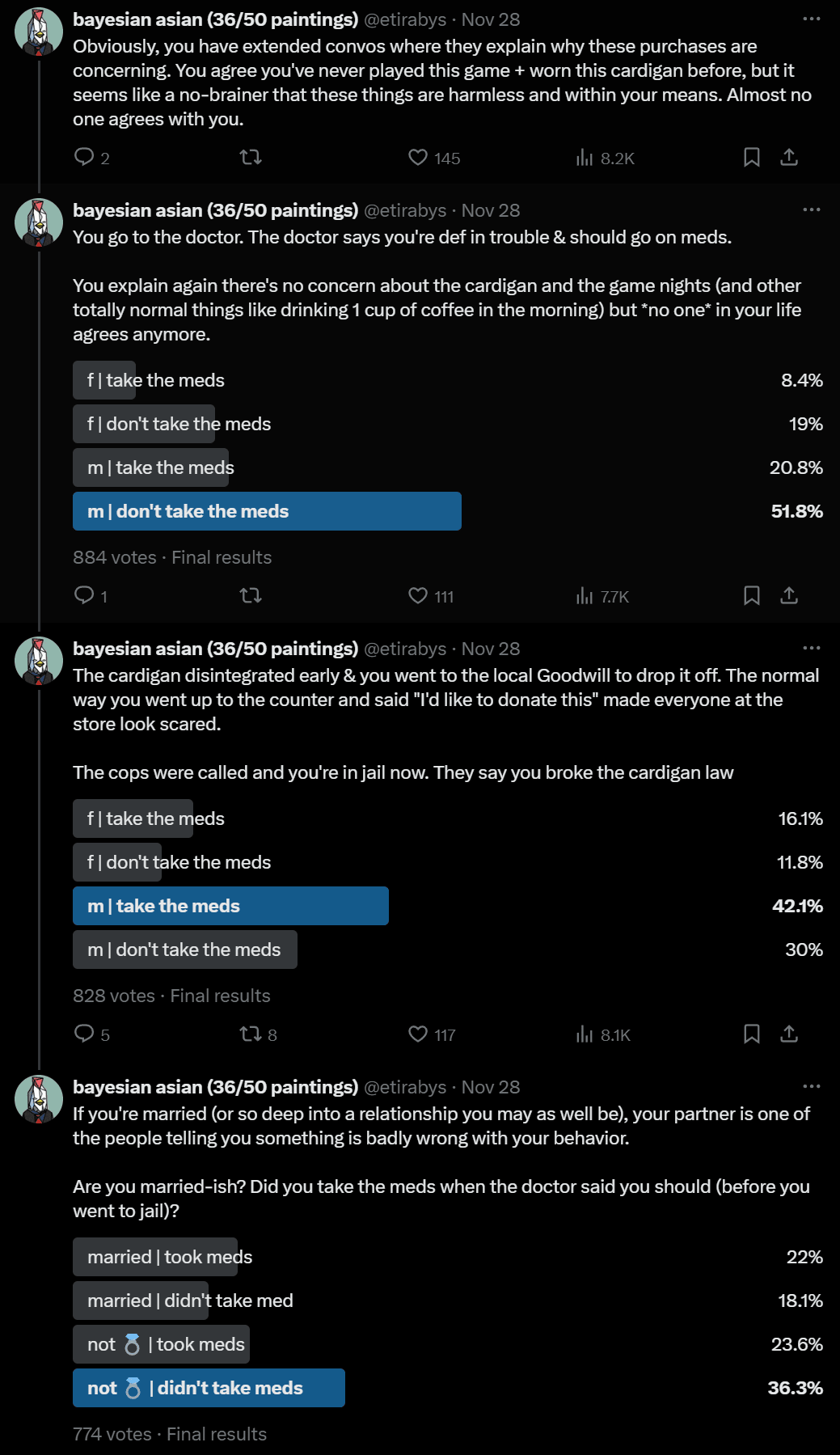 The cops additionally arresting you for a seemingly insane reason got a 60% majority to take the meds, but a lot of people still wouldn’t do it.