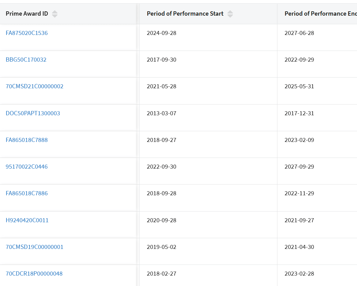 It’s all one big government operation and conspiracy, man. Except not only don’t these posts have any evidence or causal story whatsoever here, not even a fig leaf of one, these contracts are not even larger under Biden than you would have expected from what they got under Trump. If you do a search on the very database he links to and extend it back another 4 years to include the first Trump administration, and sort by contract size, you get this: