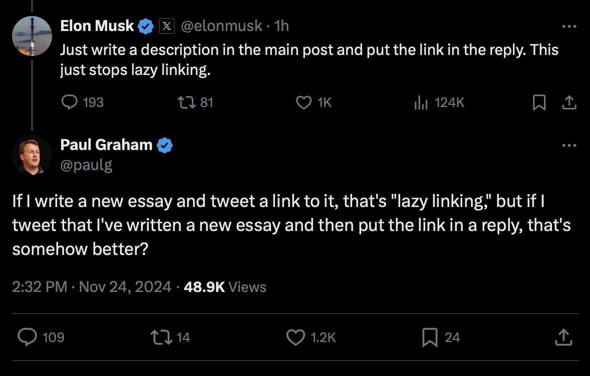 Elon Musk instead outright says ‘just write a description in the main post and put the link in the reply. This just stops lazy linking.’