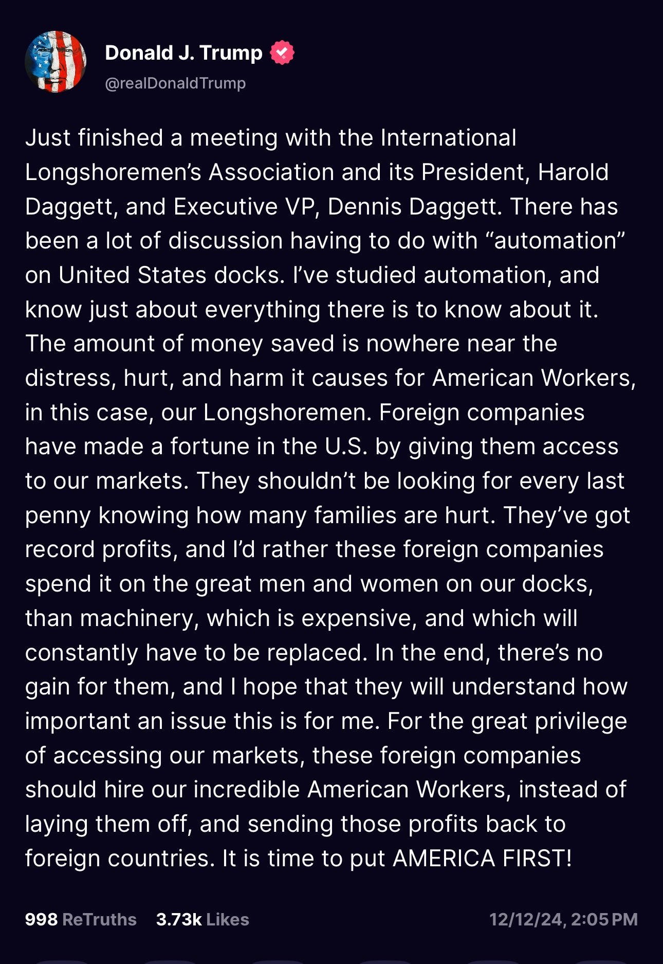 I predict that Trump’s statement opposing port automation was a substantial misstep. There is a certain crowd that really wants to be optimistic about making things work again, and this is a very clear negative signal to them.
