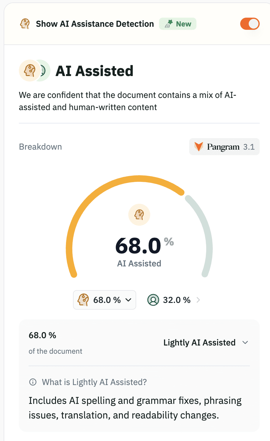 Am I crazy or does that article just read like AI slop? Pangram seems to think it's substantially AI-written[1], and my experience of reading it is definitely mostly of reading weirdly vague large metaphors that I associate with AI-slop writing.