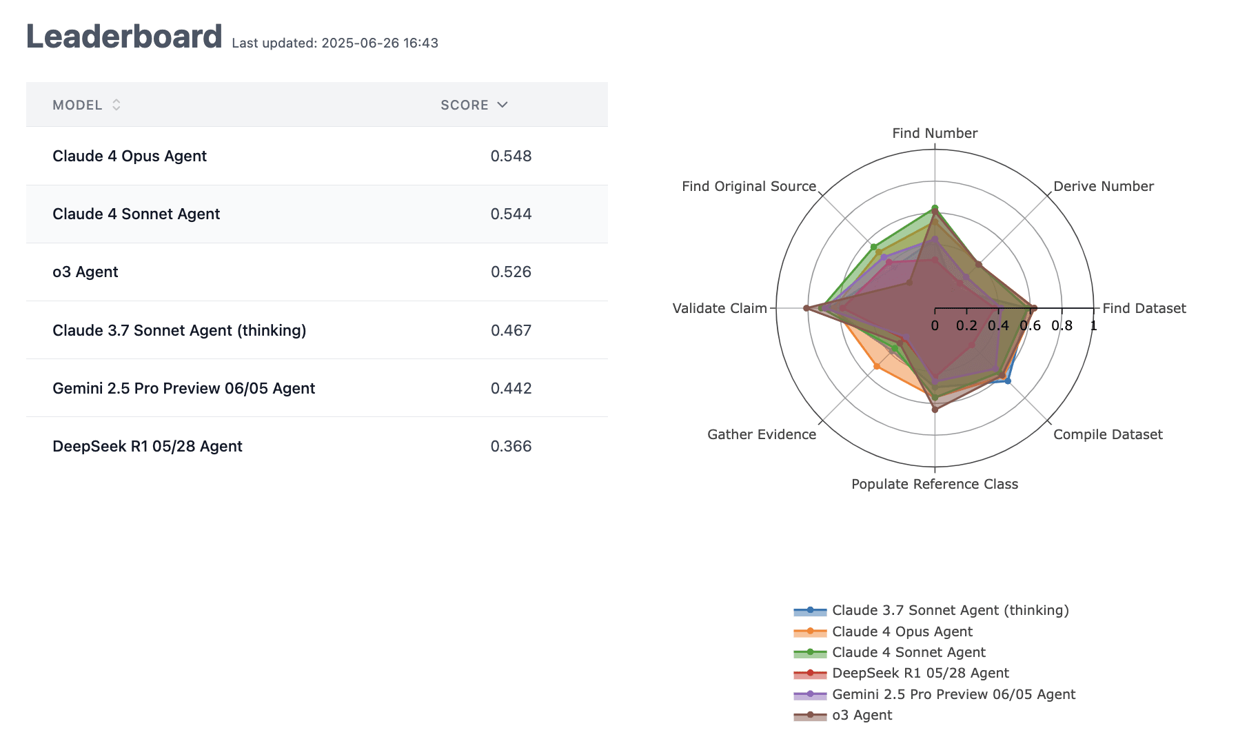 We have a continuously updated benchmark available at evals.futuresearch.ai that includes newer models such as Claude 4 (but no commercial web research tools) and is run on a frozen snapshot of the internet.[2] We'll refer to the continuously updated benchmark as DRB, and the paper version as DRB-250506. Results between the two cannot be compared directly: since the publication of the paper, we have updated both a few of our tasks as well as the agent architecture powering the LLMs.