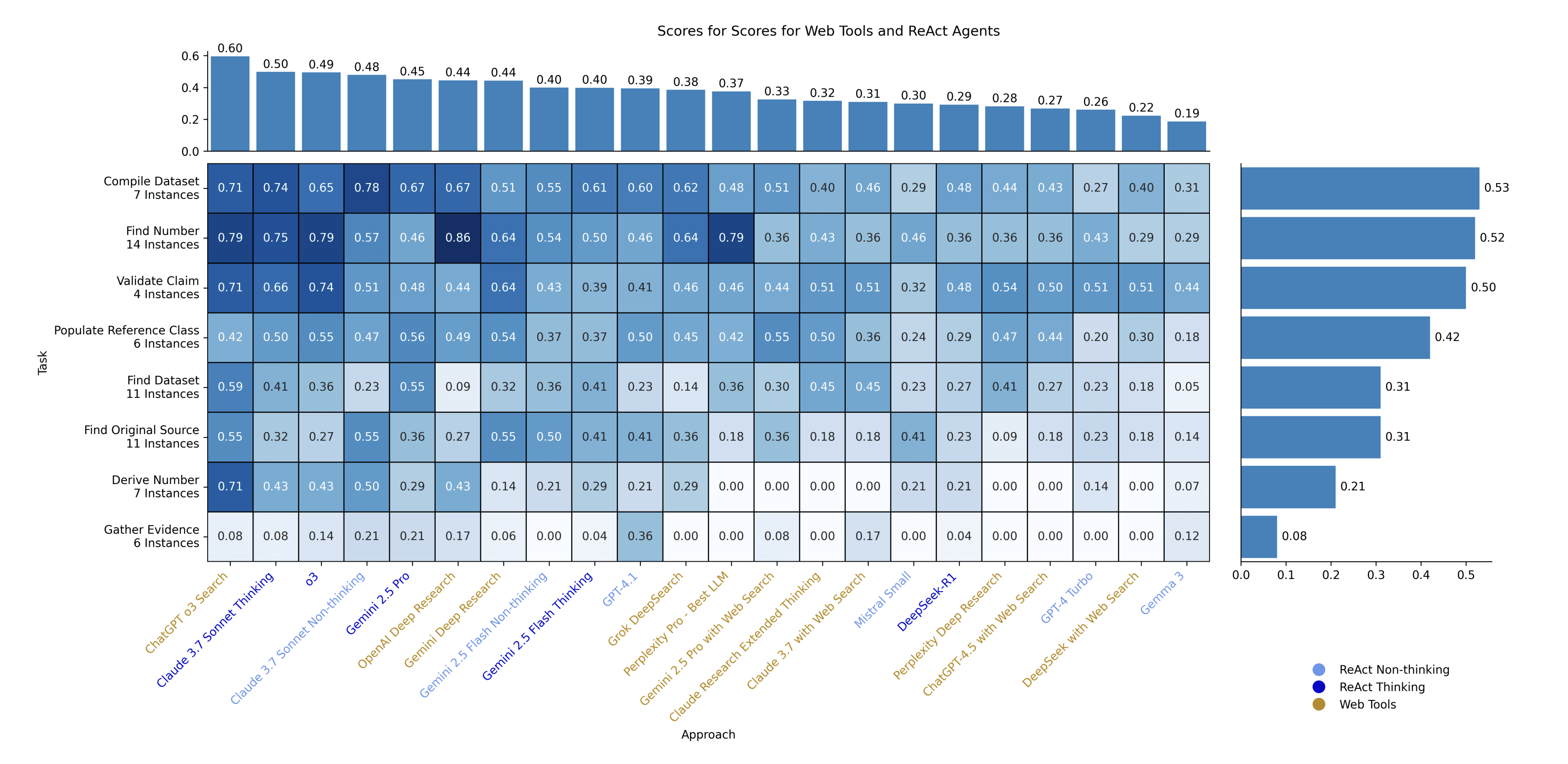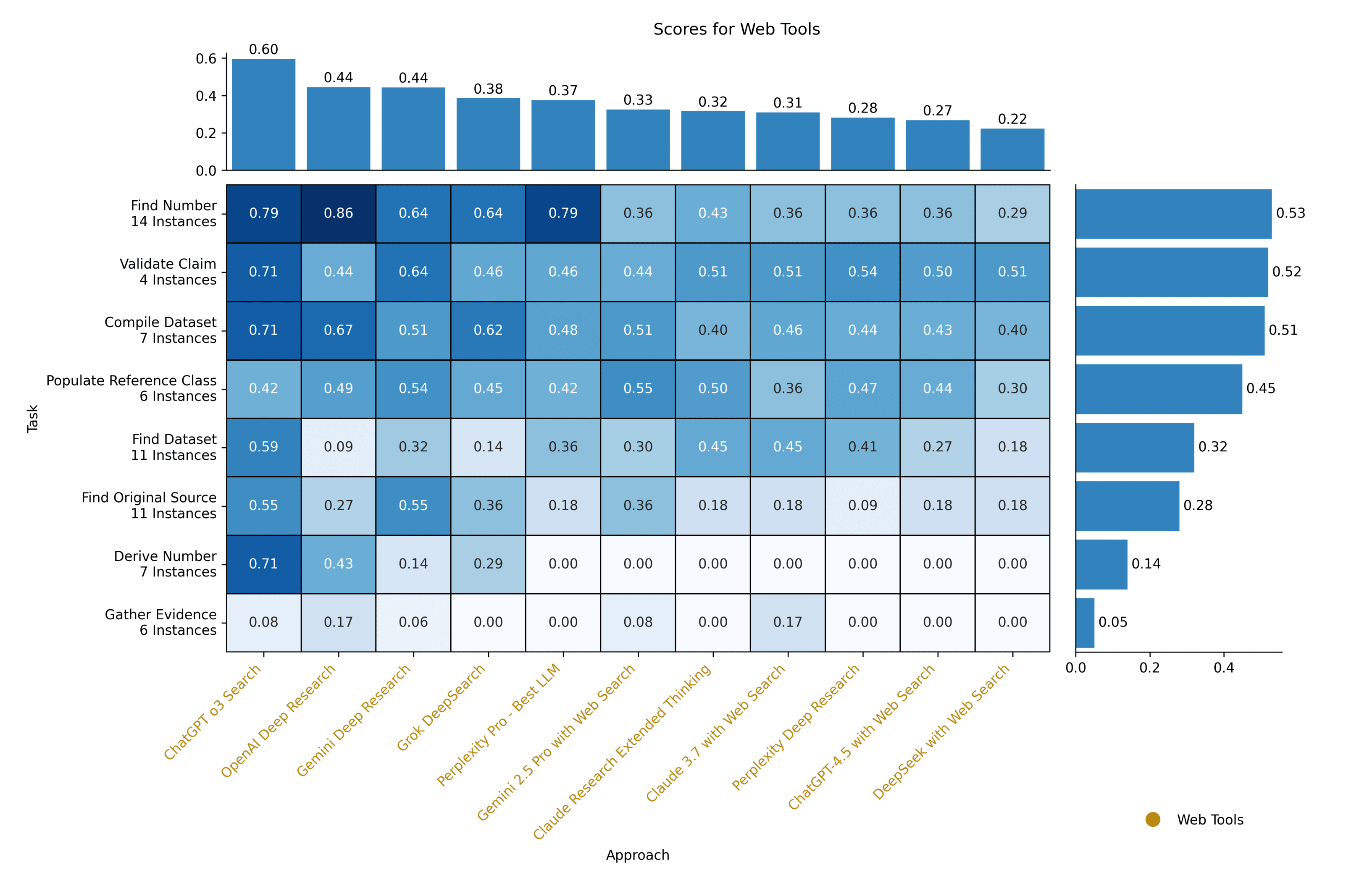 We then ran 12 LLMs, each driving a ReAct agent with tools to search the internet and query documents and web pages. We also ran our tasks one time through 11 commercial web research tools such as ChatGPT, OpenAI Deep Research, Perplexity, DeepSeek + Search, Grok DeepSearch, Claude Research.[1]