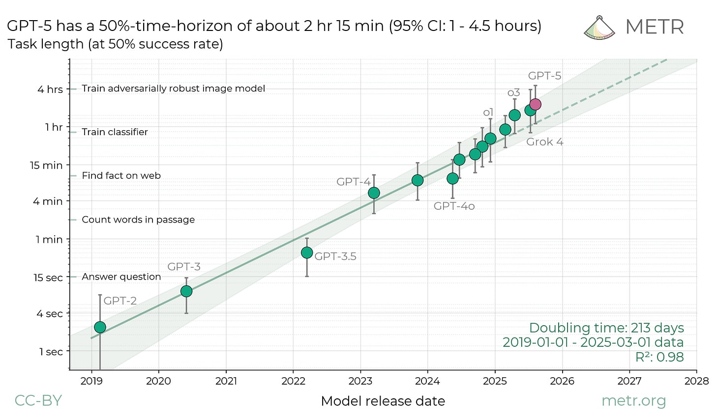 It shows that the size of software engineering tasks an AI can complete has been roughly doubling every 7 months. This trend has held for over 5 years (arguably[5]), during which the achievable task size increased from around 3 seconds to around 2 hours. Why should the trend be so steady?